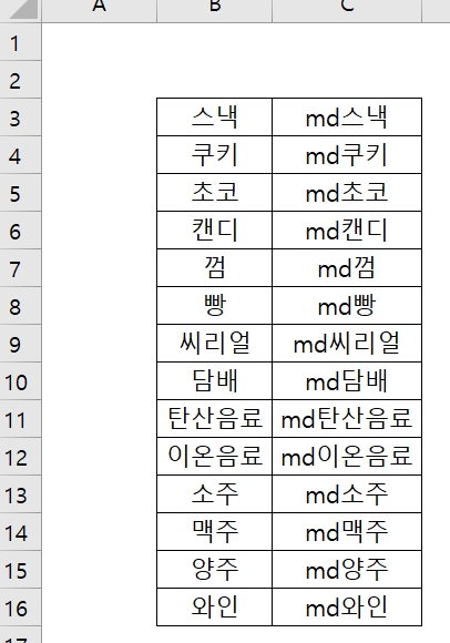 2) 열 B 첫 행에 'md OO'이라고 입력. (EX : md스낵, md쿠키...)