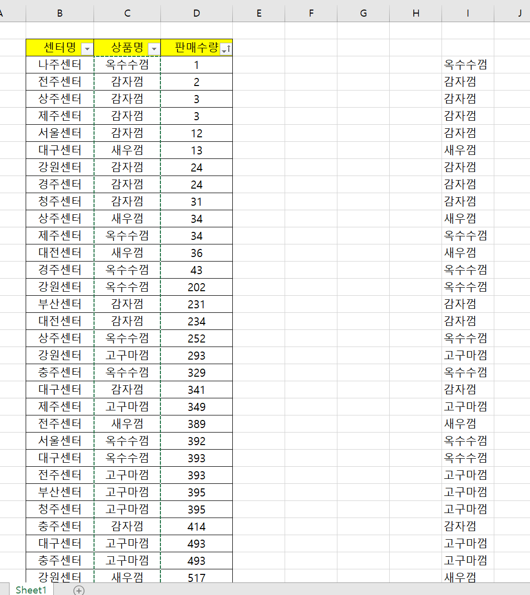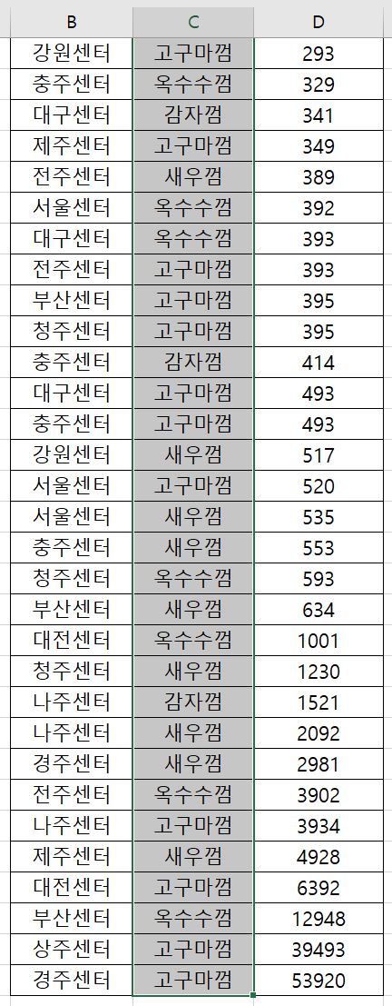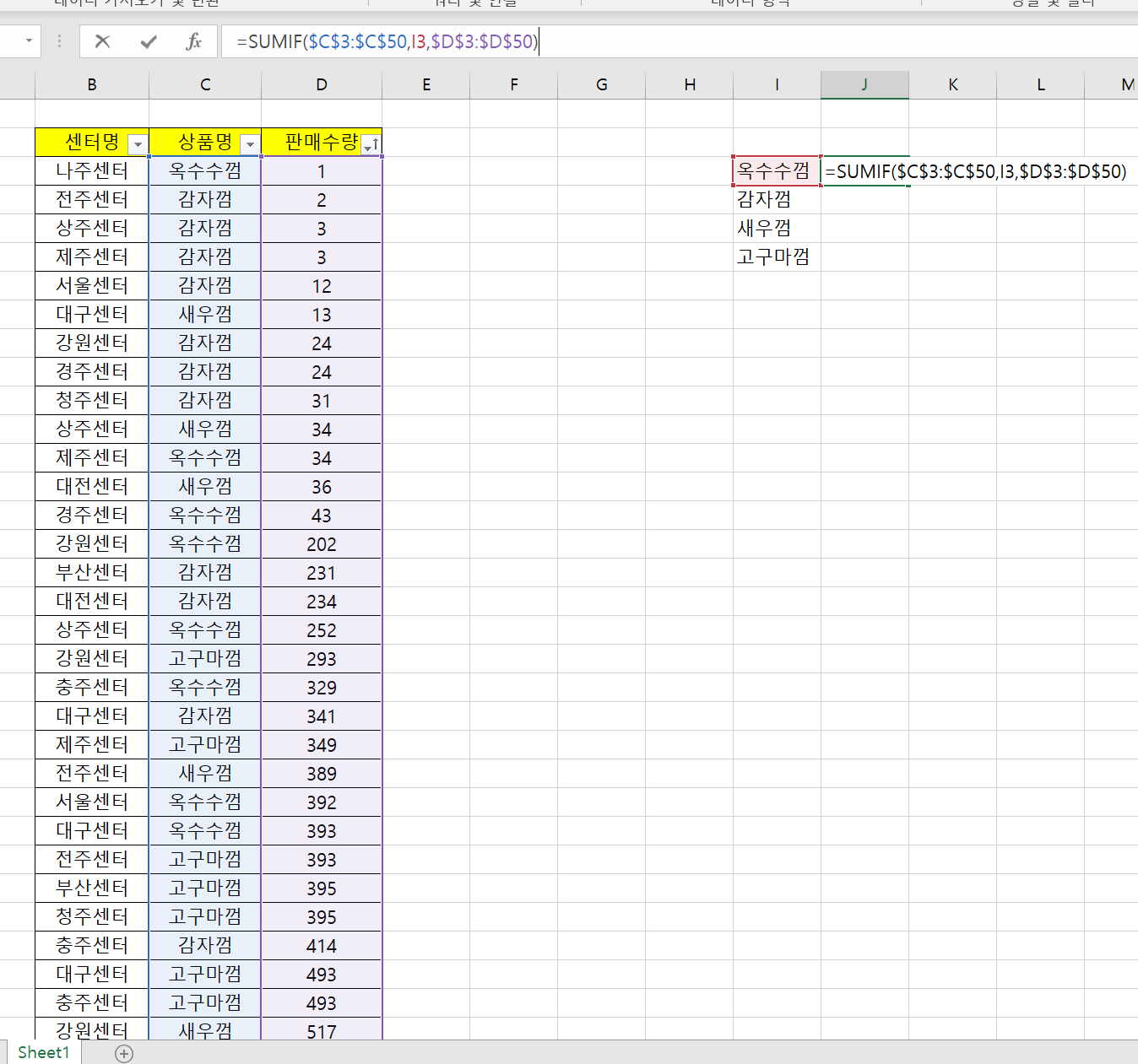 실무 할 때 정말 정말 많이 활용한 함수입니다. 제 생각엔 정말 중복값제거와 SUMIF가 찰떡궁합 만만에 콩떡 천만의 말씀 그 잡채인 것 같아요. 예를 들면 나주센터의 옥수수껌은 1개가 팔렸죠? 그런데 주욱 내려가다 보면 제주센터의 옥수수껌은 34개가 팔렸어요. 이런 식으로 옥수수껌들은 총 몇 개가 팔렸고 나머지 상품은 총 몇개가 팔렸는지 궁금할거에요. 지금 예시로 보여주는 엑셀은 상품이 몇개가 안돼서 필터로 정렬해서 더해도 무관합니다..만, 실제로 일하다 보면 막 1,000개가 넘고 10,000개가 넘는 경우도 많을 것입니다. 그럴 때는 이 SUMIF를 활용해서 더해주시면 된답니다. COUNT IF와 크게 다르지 않아요.