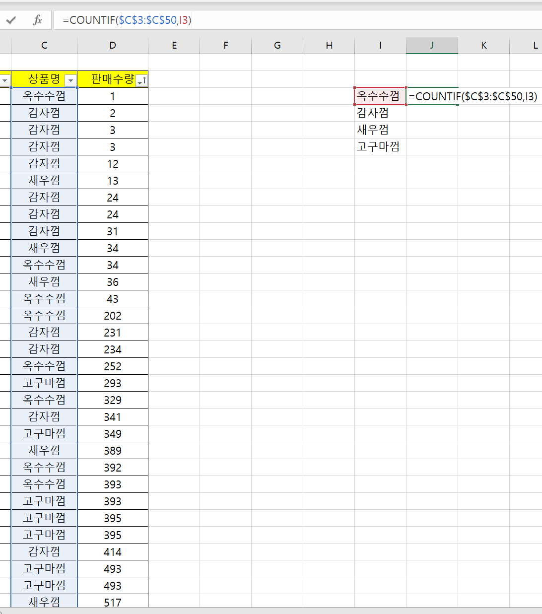 그럴 경우 COUNT IF 함수를 이용합니다. 캡처는 옥수수껌이 총 몇 개 있는지 세는 부분을 넣어놨어요
