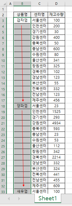 위 이미지를 예로 들어 설명드릴게요. 가끔씩 BACK자료를 복사해서 붙여넣다 보면 위와 같이 공백이 생길 때가 있어요. 아마 병합이 풀리거나 하는 경우겠죠? 그런데 이럴 때 일괄적으로 화살표 아래 방향으로 가장 상단의 값을 채우고 싶으실 때가 있을 겁니다. B4부터 B17는 감자껌을 똑같이 채우고, B19부터 B32까지는 양파껌을 똑같이 채우는 것 같이요. 물론 위와 같이 보이는 부분만 채운다면? 그냥 복사해서 붙여 넣는 게 가장 빠르겠죠? 그런데 보통 가공하는 자료들은 어떤가요? 정말 그 숫자가 많아요. 그렇다면 이동, 빈칸 선택이라는 기능으로 손쉽게 한꺼번에 붙이는 방법을 알려드릴게요.