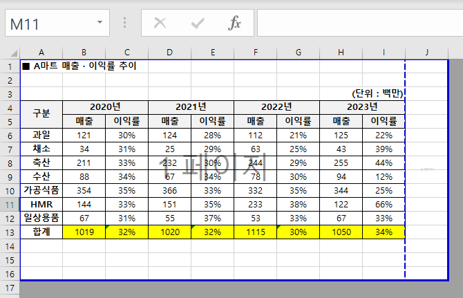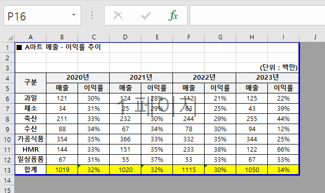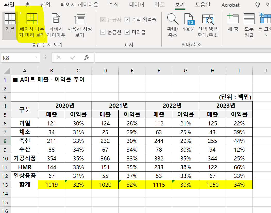 이런 화면을 본 적이 있나요? 인쇄영역 때문인지 모르겠는데 저희 회사에서는 일할 때 엑셀을 이렇게 자주 바꾸더라고요.