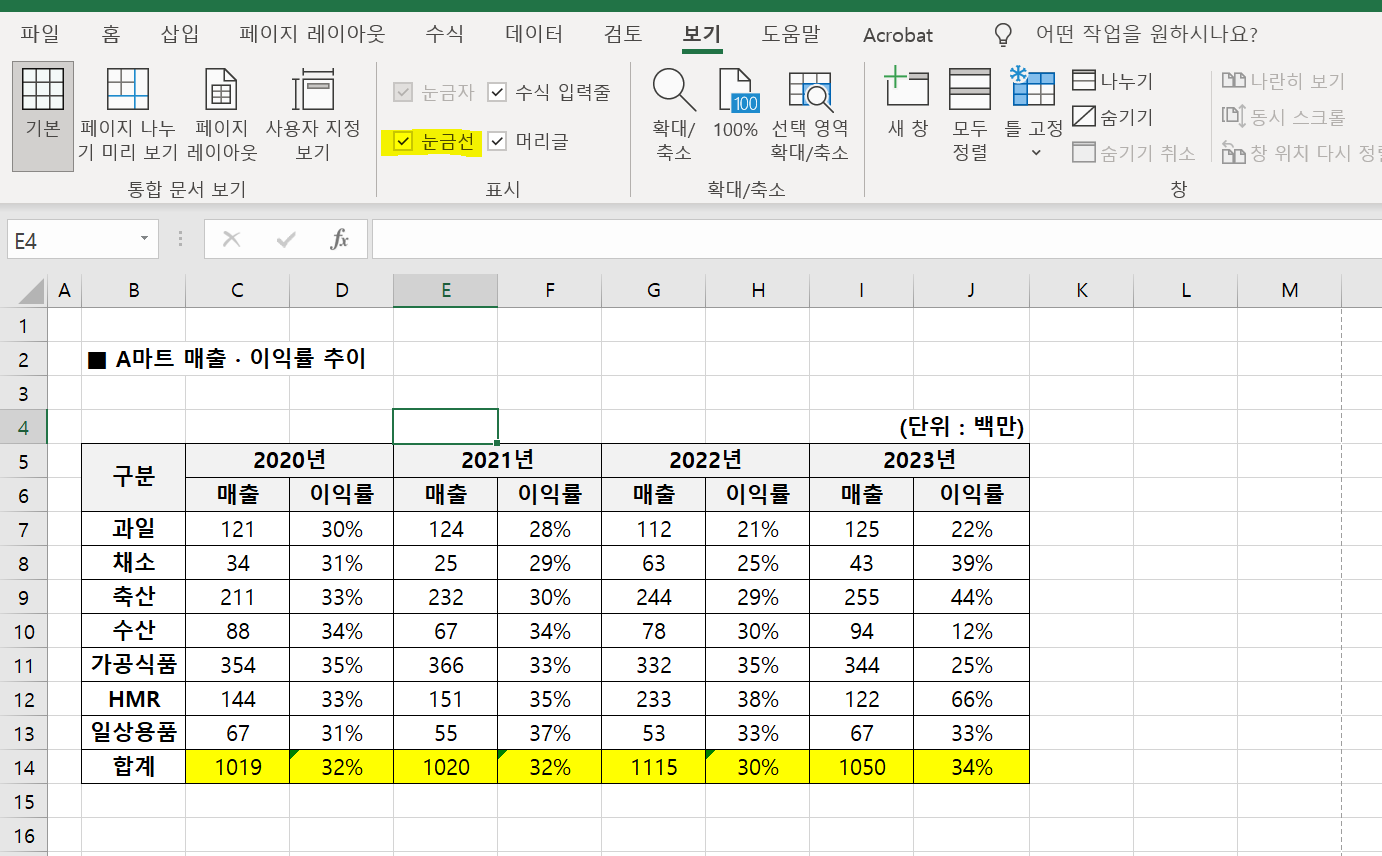 그럴 때는 보기- 눈금선 체크박스 해제를 해주시면 됩니다. (노란색 음영 보이시나요?)