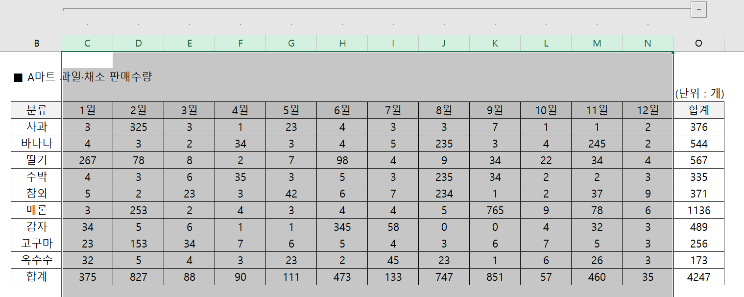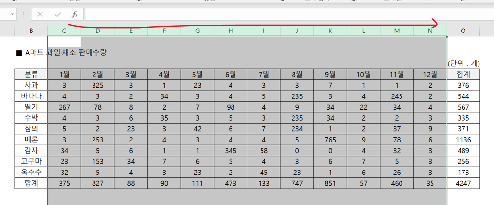 위와 같은 표가 있다고 가정을 해볼게요. 가장 오른쪽에는 분류가 있고 가장 왼쪽에는 합계가 있죠?