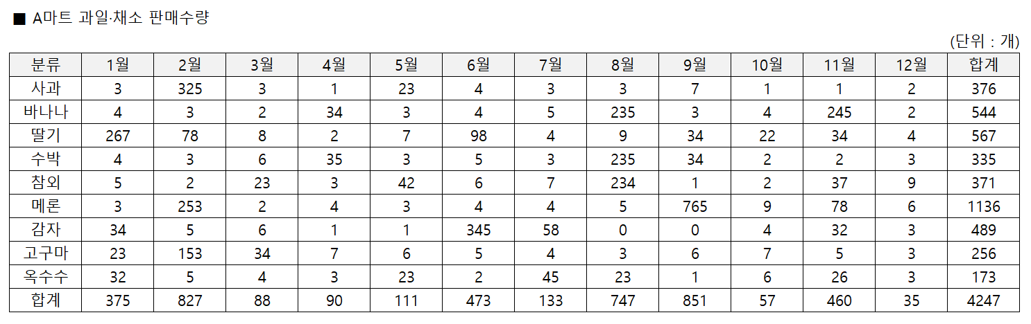 월별로 판매수량을 보고 싶다면 이 표자체가 유의미 하지만